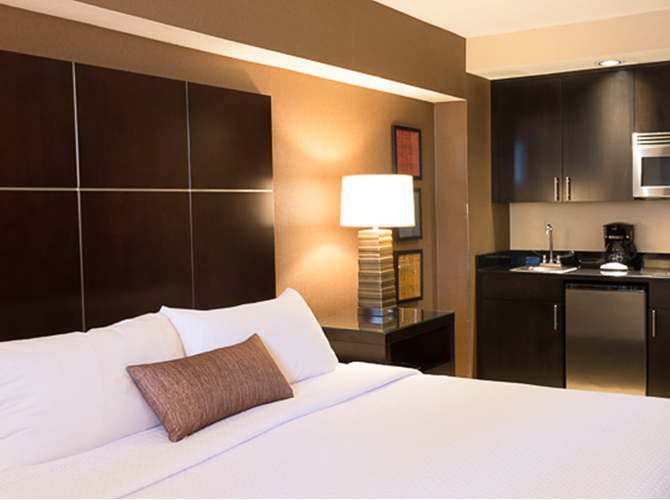 1 King Bed- kitchenette- complimentary Wi-Fi and in room safe-non smoking rooms only The Deluxe Guest room has 1 king bed and a fully equipped kitchenette w/small refrigerator, microwave & coffee maker with complimentary coffee provided daily. Cookware, dinnerware, flatware, towels & utensils are provided in each kitchenette. In room amenities include complimentary Wi-Fi, remote DirectTV, a full size ironing board and iron, and complimentary safe. These rooms are non-smoking only.